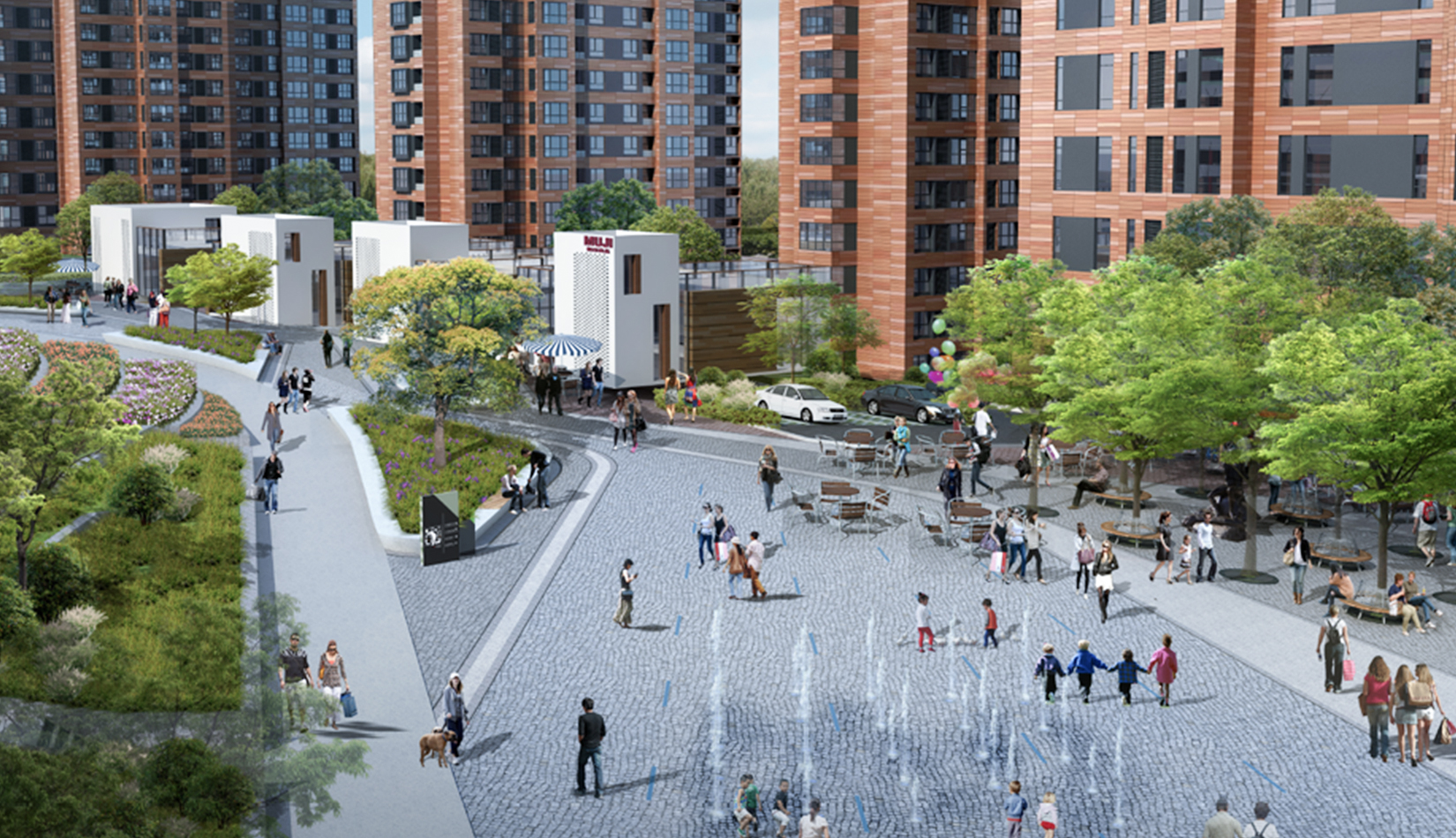 結合高差設計的中央景觀軸線,設計需呼應貫通,通過多軸手法形成豐富的景觀效果。自然的斜坡,景觀臺階,階梯式草坪等多種建筑景觀手段與之相映成趣。