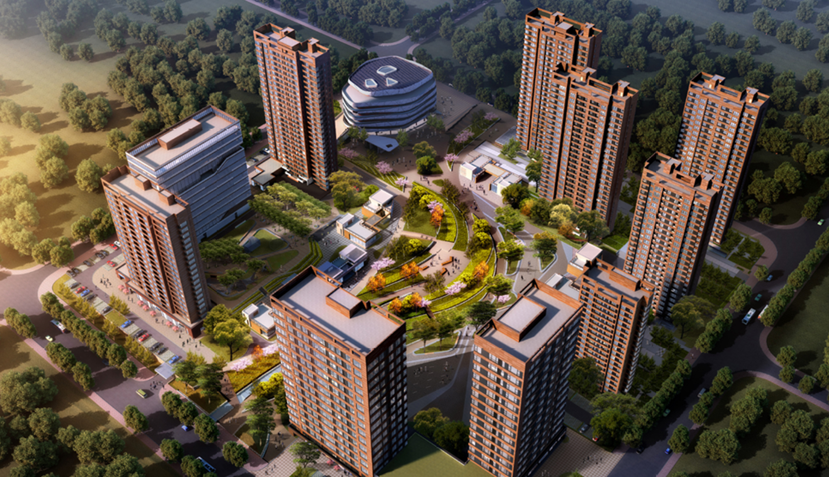 規(guī)劃布局在現(xiàn)有景觀基礎上進行延伸,在重要景觀帶上設置公共功能,造型與現(xiàn)有德國中心呼應,靠近中間廣場的混合住宅設計中融入綠色理念,既達到景觀帶到建筑群組的滲透,又達到建筑內部的滲透,真正做到人與自然融合,建立了一條“城市紐帶”,利用周邊現(xiàn)有資源(河洛埠水庫),通過連橋、綠地和廣場將不同功能,不同高度的公共區(qū)域串聯(lián)起來,從而形成一個結構明晰,功能復合又互通互聯(lián)的文化交流城。