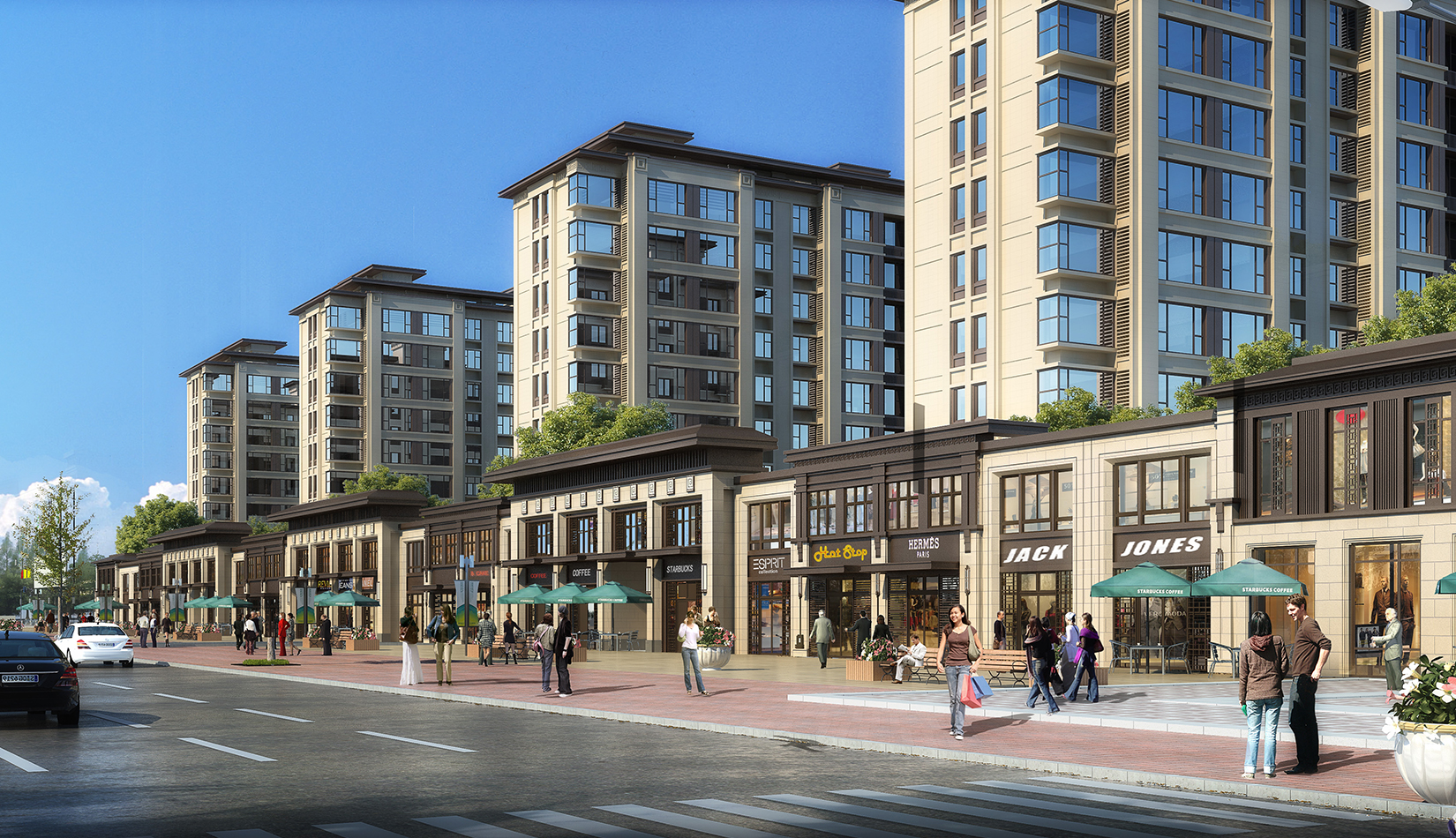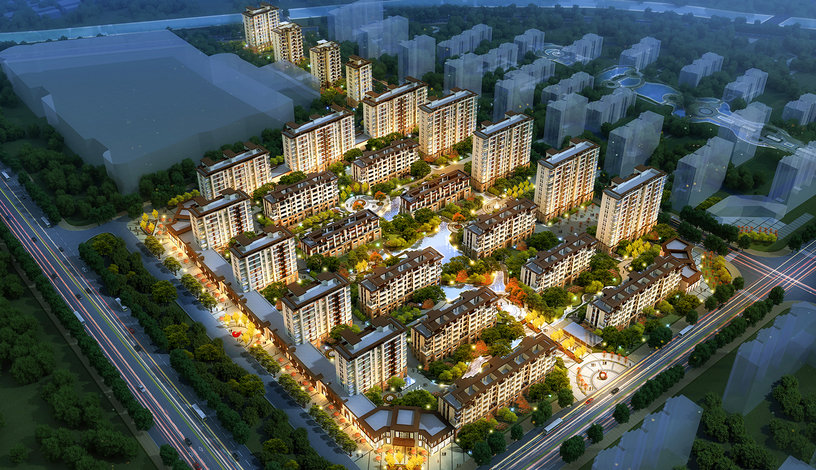 通過對基地場地價值的分析,綜合考慮容積率、建筑密度及航空限高等問題,以小高層住宅、花園洋房、疊拼別墅結(jié)合考慮規(guī)劃布局。景觀主要應(yīng)以內(nèi)部打造為主。建筑布局外高內(nèi)低,將多層產(chǎn)品放在中間較好的位置,同時形成建筑高度向中心景觀帶疊落的空間感覺,最大化利用中心景觀帶。