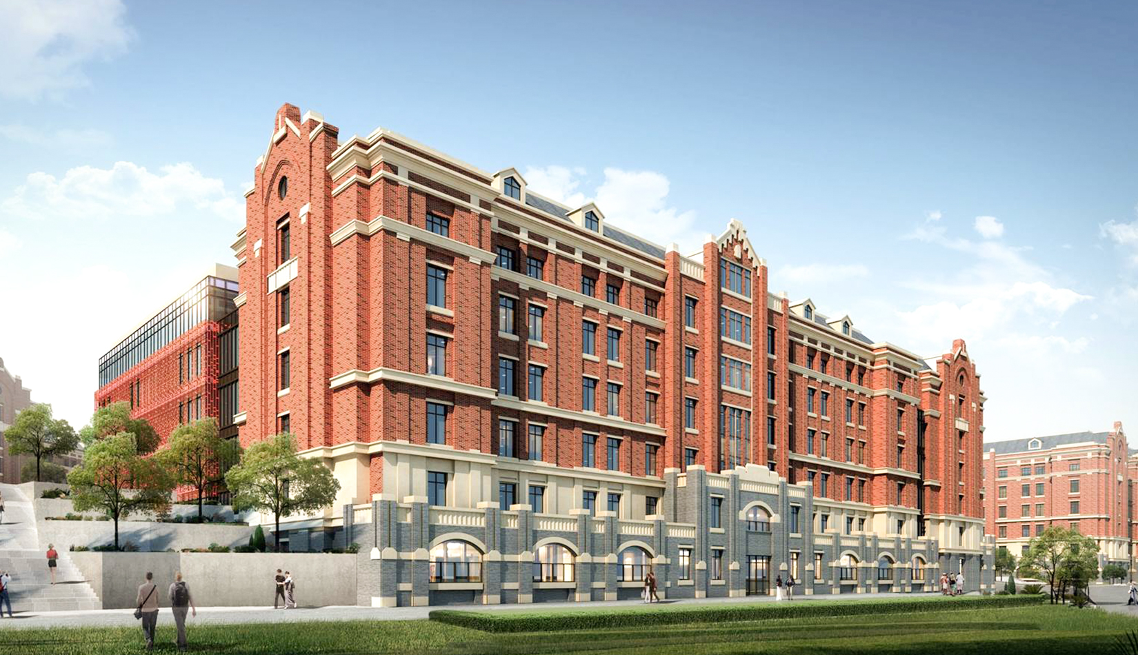 本項目位于中德生態(tài)園東側(cè),東側(cè)、南側(cè)與九中相鄰,在設(shè)計時充分考慮周邊建筑現(xiàn)狀,采用紅磚灰頂?shù)挠⑹斤L格作為建筑立面。紅瓦灰頂,相互借勢,打造中德門戶建筑。