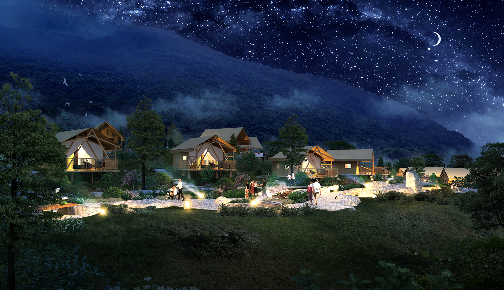 根據(jù)基地的地勢分布及功能需求,空間結(jié)構(gòu)上分為“一帶兩軸三核心五組團”。建筑設計的五個組團,分別是濱水休閑組團、水畔風光帳篷組團、高端養(yǎng)心帳篷組團、中心服務組團及山居野趣帳篷組團。客房部分采用帳篷度假屋的方式,凸顯野奢度假的浪漫形式。