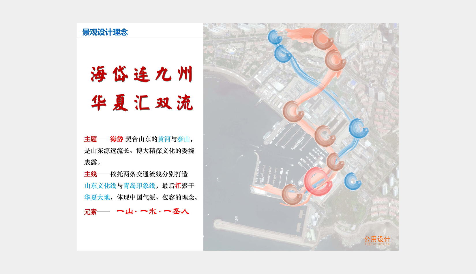 在此基礎(chǔ)上,確定迎賓動線方案,完善整個區(qū)域動態(tài)及靜態(tài)交通規(guī)劃,結(jié)合奧帆中心原有的景觀資源和山東、青島文化元素,以“海岱連九州,華夏匯雙流”為景觀設(shè)計理念,布局重要景觀標(biāo)志節(jié)點(diǎn)。