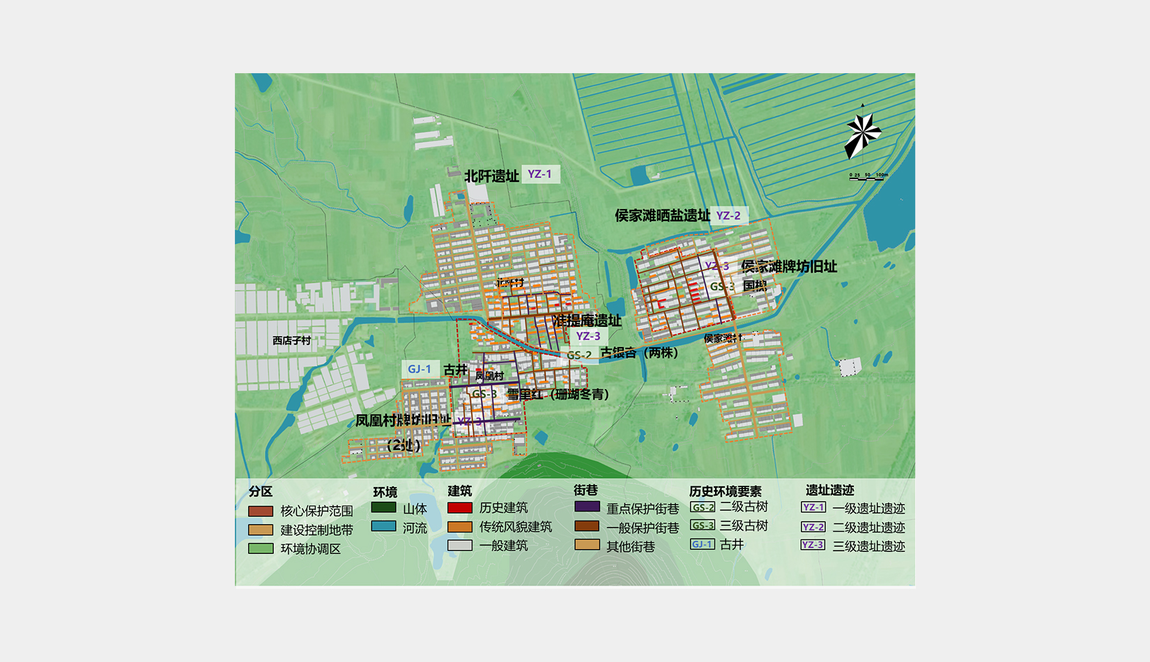 金口村保護規(guī)劃總圖分為五級:分區(qū)保護、建筑保護、街巷保護、歷史環(huán)境要素保護、遺址遺跡保護。