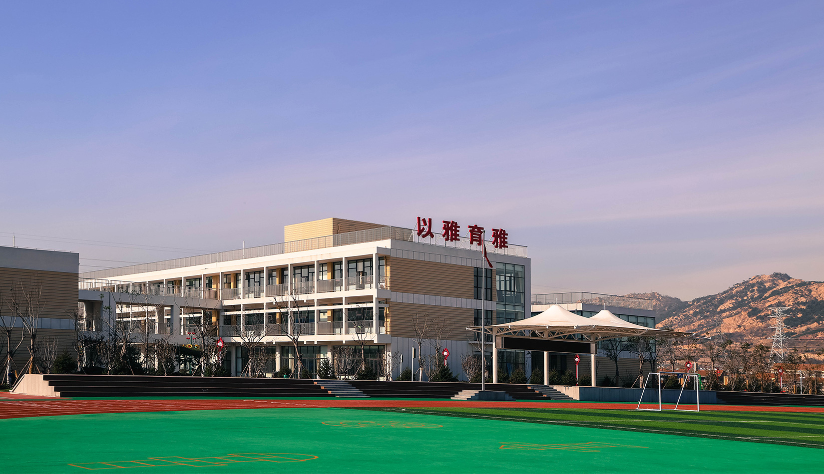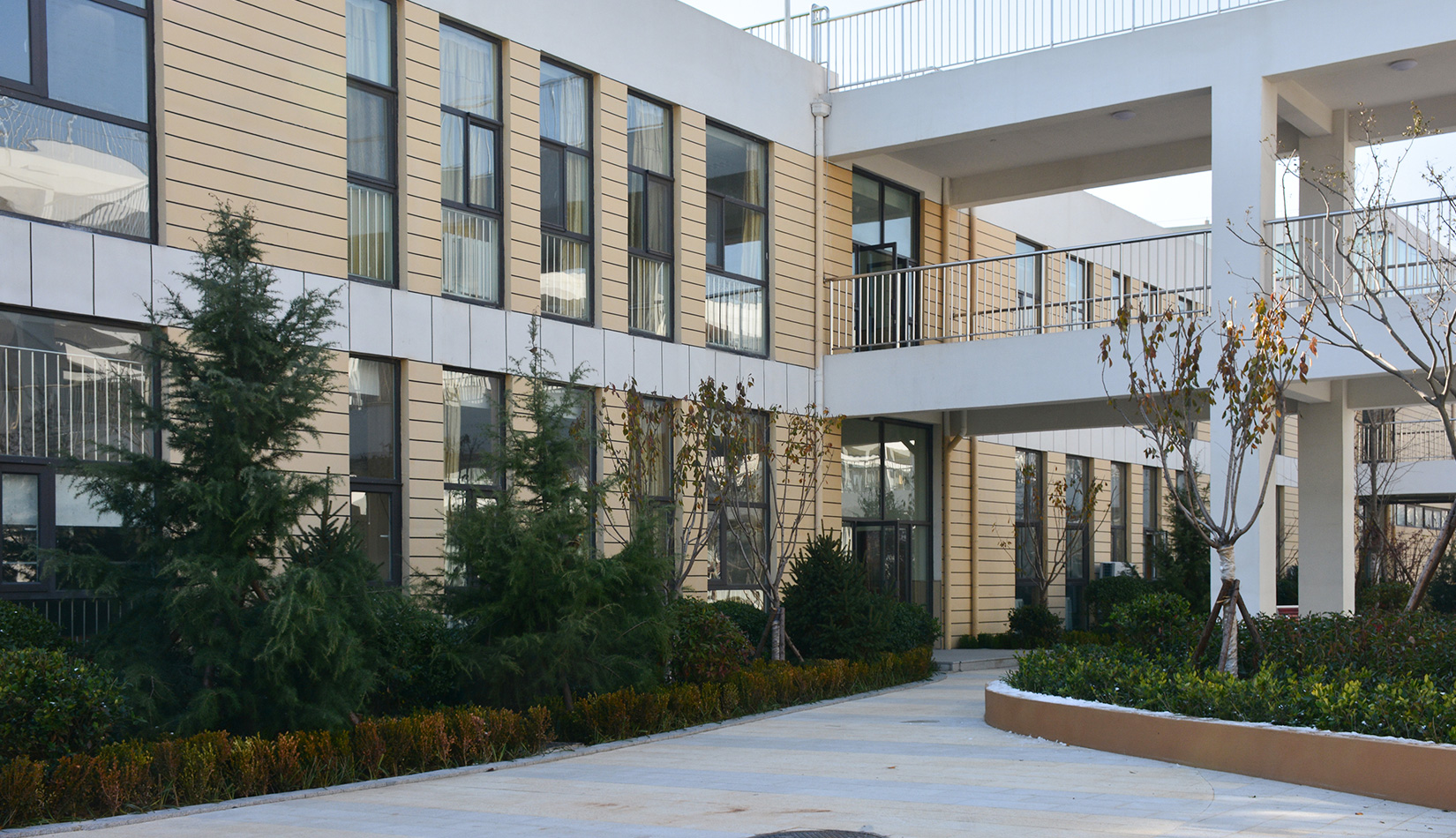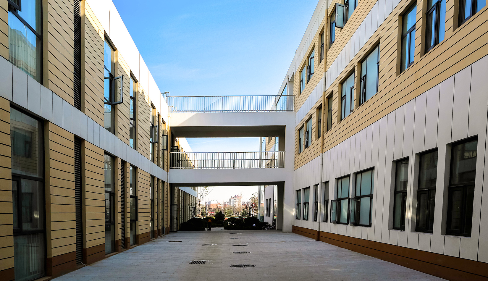 該項(xiàng)目通過幾個(gè)建筑單體與架空走廊的穿插連接將整個(gè)校區(qū)有機(jī)聯(lián)系起來,實(shí)現(xiàn)了建筑功能的整體性,完善了建筑可達(dá)性。形成的中庭空間可成為交流為主的平臺,營造了學(xué)習(xí)、活動為一體的校園氛圍。建筑外立面以簡潔的現(xiàn)代風(fēng)格為主,同時(shí)表現(xiàn)校園文化,主要采用黃色與白色真石漆形成色彩對比,在教室南立面、樓梯間、就餐區(qū)等采用整體通透的玻璃幕墻與實(shí)墻形成虛實(shí)對比,形成簡潔而不失活潑的建筑風(fēng)格。利用借景等手法進(jìn)行室外綠化設(shè)計(jì),整體打造一個(gè)高品質(zhì)的學(xué)校環(huán)境。