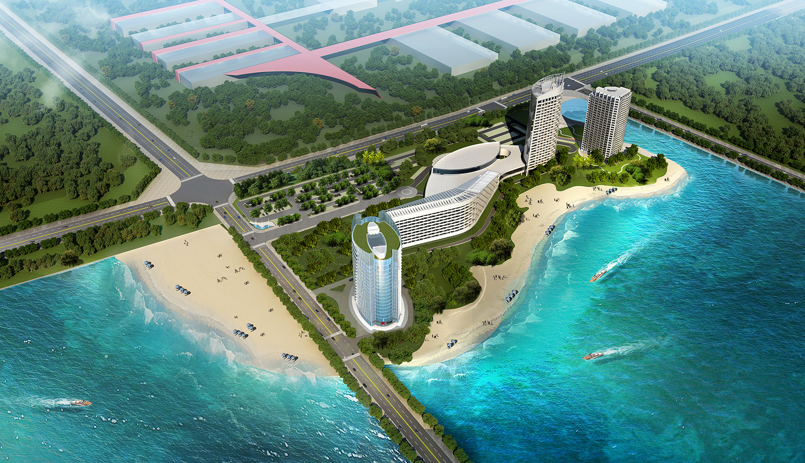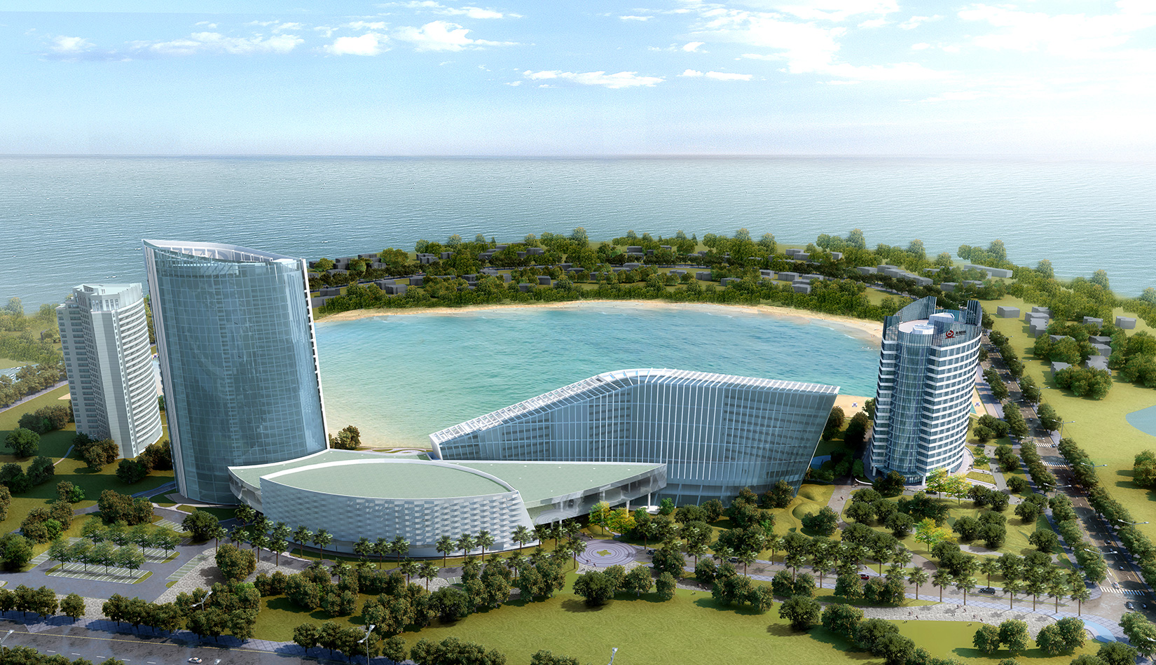 項(xiàng)目充分考慮酒店一期建筑及其對空間、道路、周邊環(huán)境的影響,盡量將二期建筑順勢布置,與一期形成完整的有機(jī)整體;將局促且形狀不規(guī)則的用地進(jìn)行合理組織,使建筑、道路、景觀得到恰當(dāng)?shù)陌才?;與一期建筑相對獨(dú)立,又能夠共享景觀、道路等資源,達(dá)到使用上的便捷、舒適;在滿足建筑功能及使用的前提下,盡量減少建筑的高度、長度、突出一期的主導(dǎo)地位,是對整個(gè)環(huán)境的補(bǔ)充和完善,提升土地價(jià)值和環(huán)境品質(zhì)。